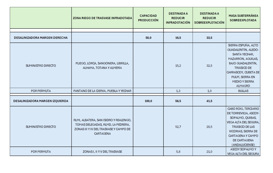 En el caso de la instalación de Torrevieja, esta producirá 58,5 hm3 para bajar la infradotación del Campo de Cartagena, Albatera, San Isidro y Realengo, La Pedrera, así como las zonas III y IV del Trasvase. De esos 58,5 hm3, 52,7 serán directos y 5,8 por permuta para las zonas I, II y V del Trasvase. El resto de la producción, los 41,5 hm3, abarcarán masas subterráneas sobreexplotadas como Cabo Roig, Terciario de Torrevieja, Ascoy-Sopalmo, Quibas, Vega Alta del Setgura, Trisiásico de las Vicroias, Sierra de Cartagena y Campo de Cartagena.