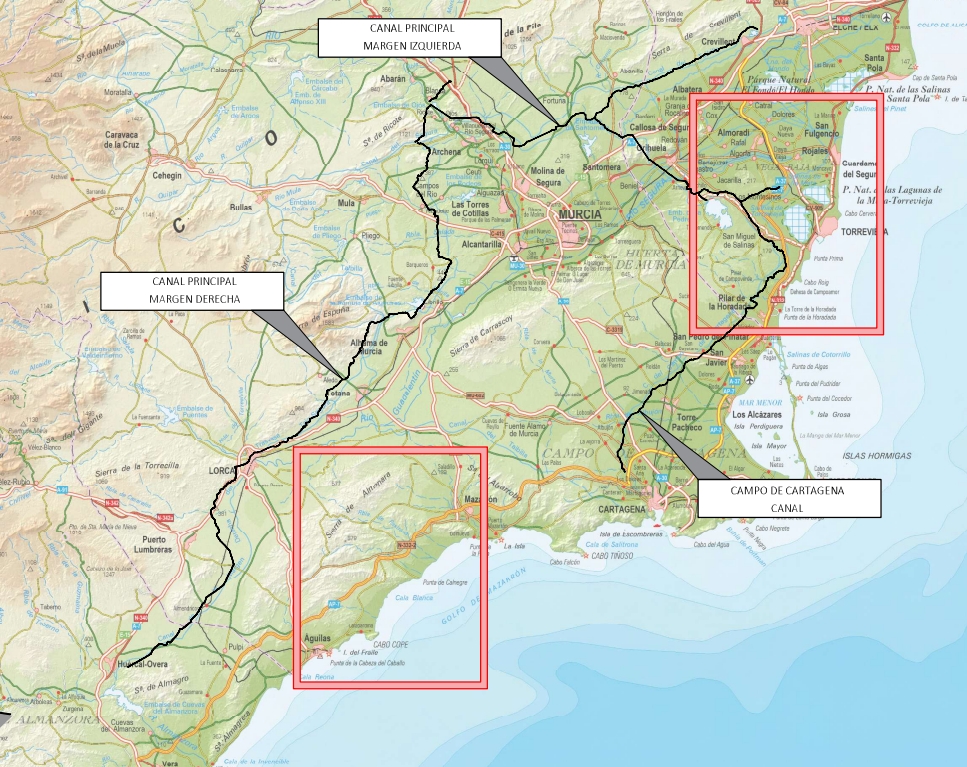 MURCIA. Un día después de que el líder del PSOE de la Región de Murcia, Francisco Lucas, adelantara la inminente licitación de los proyectos para las futuras desaladoras de Águilas y Torrevieja, ya se van conociendo los detalles de las dos infraestructuras. La Confederación Hidrográfica del Segura busca cubrir con las dos plantas hasta 150 hm3 de agua desalada al año, tanto en la margen izquierda (a través de la desalinizadora de Torrevieja) como en la derecha (mediante la instalación de Águilas) de los canales del Trasvase Tajo-Segura (los llamados Canales del Postrasvase).