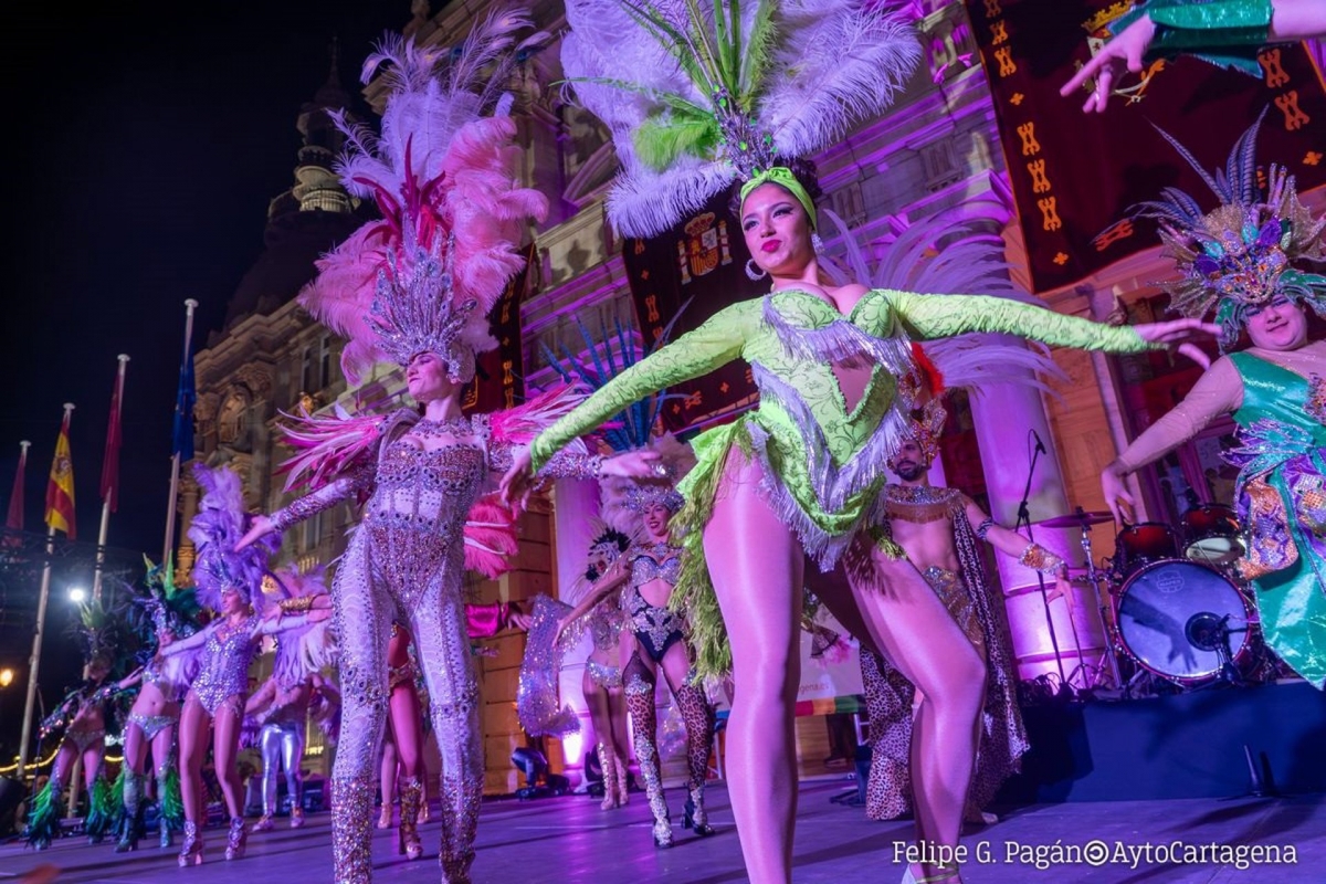 El balcón principal del Palacio Consistorial ha vuelto ha vuelto a ser escenario del gran inicio del Carnaval de Cartagena, fiesta que llena de alegría, música, bailes y color la ciudad, y que este año, además, ha tenido una gran repercusión a nivel nacional tras desfilar, el pasado mes de enero y con motivo de la celebración de FITUR, por las calles más céntricas de Madrid.