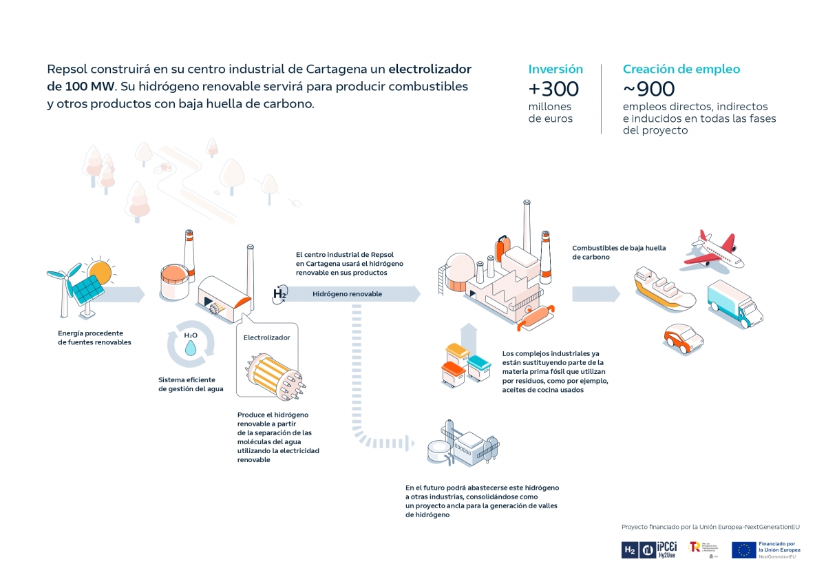 El complejo industrial de Repsol en Cartagena, que este año celebra su 75 aniversario, se ha convertido en un referente en transformación industrial liderando proyectos punteros, como la primera planta de producción a gran escala de combustibles 100% renovables de la península ibérica, y la primera planta de hidrógeno renovable de la Región de Murcia.
