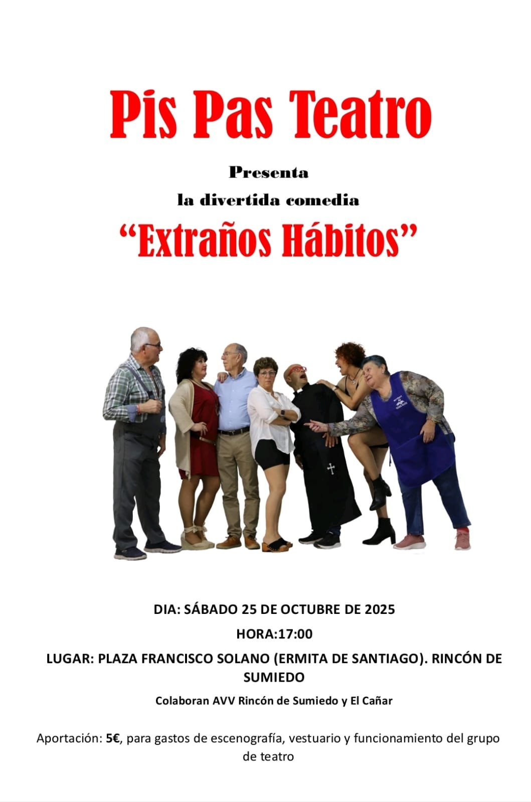 A las 17:00 horas del sábado 25 de octubre la compañía ‘Pis Pas Teatro’ representará la divertida comedia ‘Extraños hábitos’, que podrá ser vista con una aportación de 5 euros destinada a los gastos de escenografía, vestuario y funcionamiento del grupo teatral. Durante la obra se servirá a los asistentes churros con chocolate.