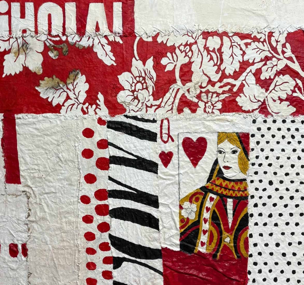 En las obras de la muestra, Casanova combina técnicas como pintura, collage, bordado, papeles, telas y tipografías para construir imágenes estratificadas que conviven entre lo gráfico y lo pictórico, y que plantean una reflexión sobre cómo percibimos y construimos el mundo en un contexto de imágenes superpuestas y relatos fragmentados.