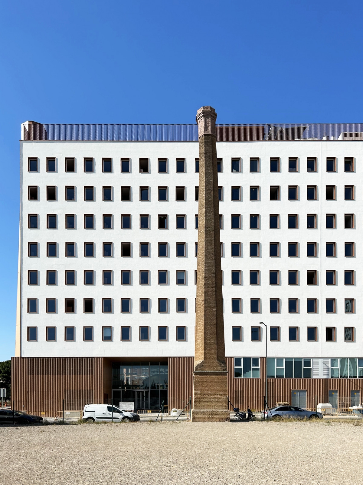 El proyecto premiado de Martín Lejarraga no olvida, por otro lado, el pasado industrial de la zona que ocupa, dando protagonismo a la chimenea de ladrillo de una fábrica que se conserva en el lugar y que inspira el diseño del edificio, tanto en determinados volúmenes de la fachada como en el color