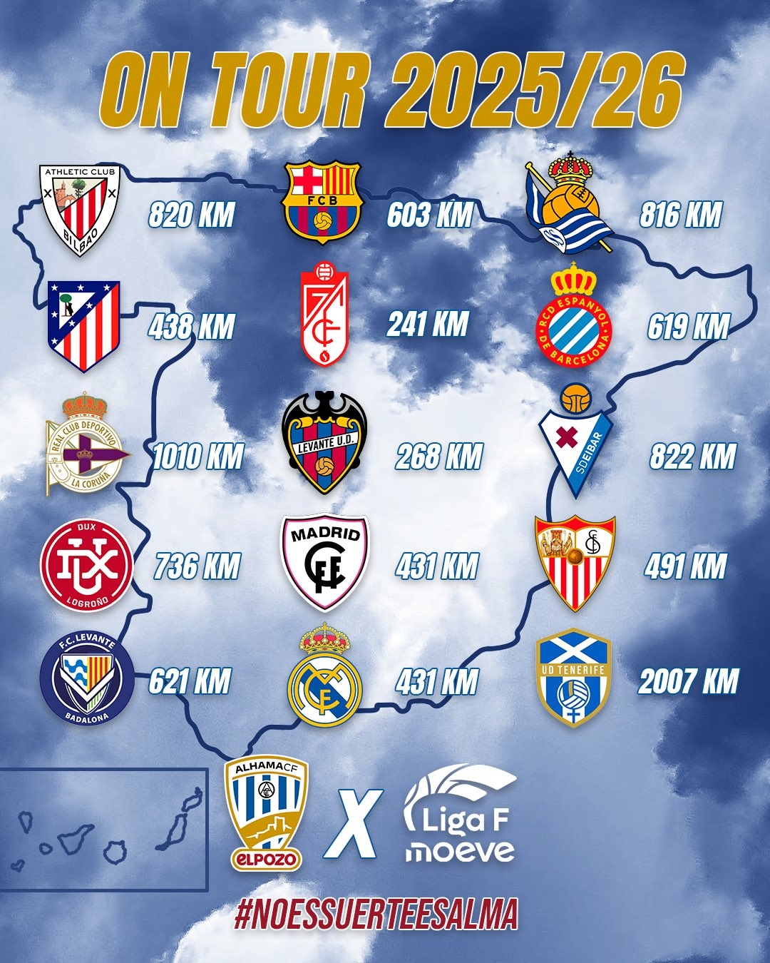 ALHAMA DE MURCIA. El Alhama Club de Fútbol ElPozo realizará 20.708 kilómetros en la Liga F del curso 2025/2026 con los 15 desplazamientos que realizará durante el campeonato en la máxima categoría nacional, con el trayecto más corto a Granada y los más largos a la isla deTenerife, inevitablemente en avión, y a La Coruña.