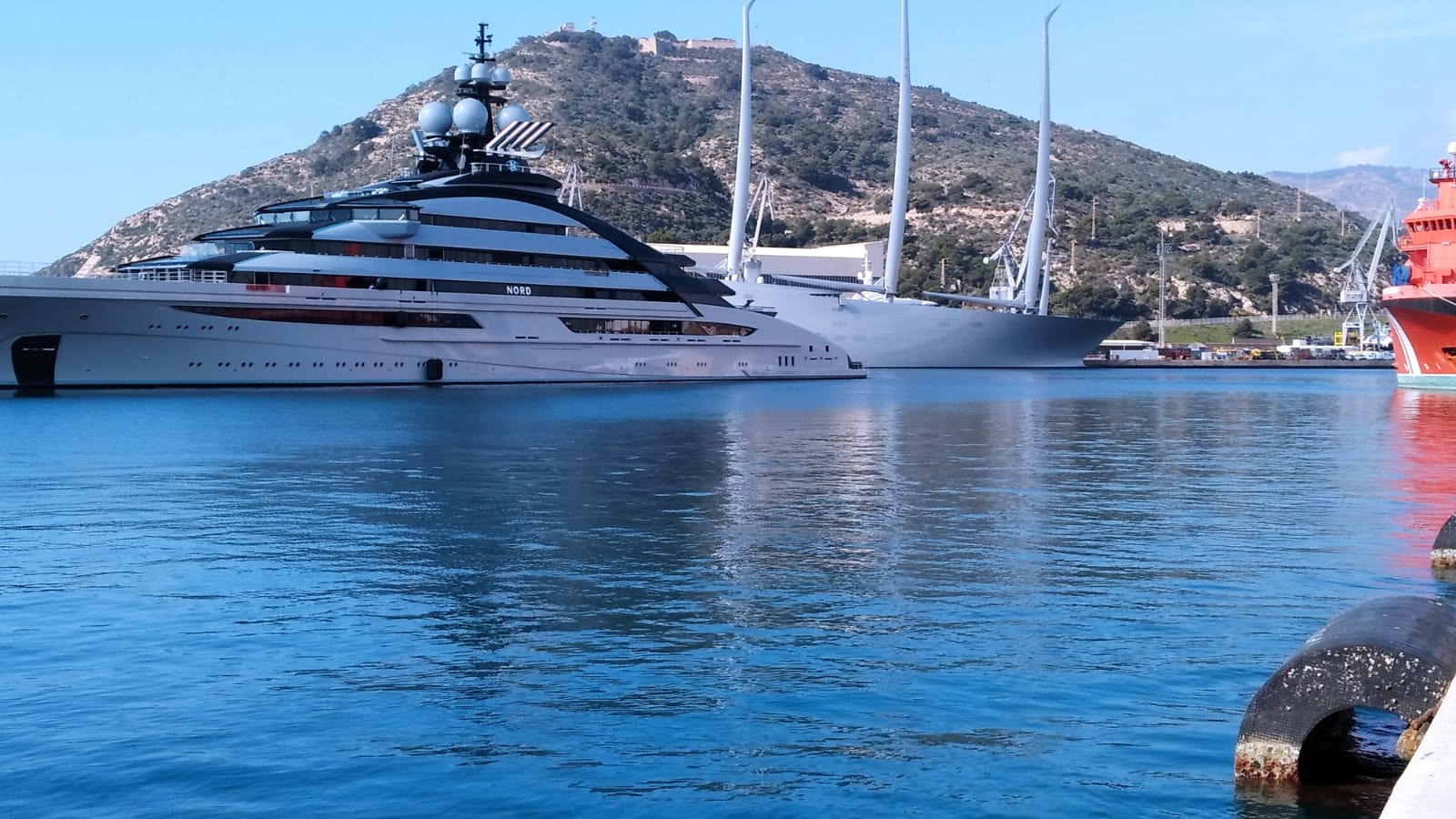 CARTAGENA. Una imagen inusual acapara la atención de todo aquel que se acerca estos días por el puerto de Cartagena. Dos megayates, con propietario ruso, presiden estos días la estampa de la ventana al mar de Cartagena. Se trata del yate de lujo Nord y del megayate Sailing Yatch. El primero arribó a la Trimilenaria el pasado 1 de marzo, mientras que el segundo se encuentra en reparación desde el pasado mes de febrero.