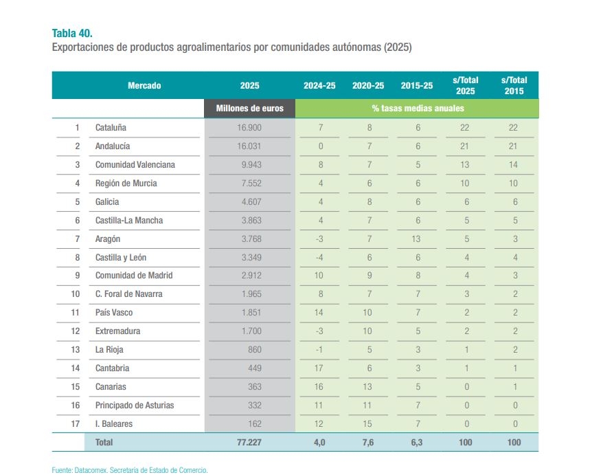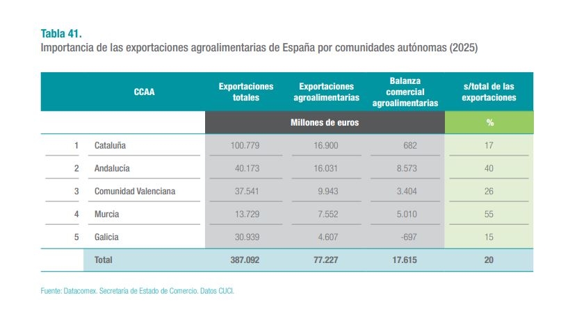 El estudio también sitúa a la Región en la cuarta posición del ranking nacional, solamente superada por Cataluña, que recuperó en 2025 el primer puesto como región exportadora agroaliementaria con 16.900 y un crecimiento del 7%, Andalucía, con 16.031 millones y un crecimiento cero (castigada por la bajada de la venta de aceite de oliva) y la vecina Comunidad Valenciana, que obtuvo 9.943 millones y un aumento del 8%.