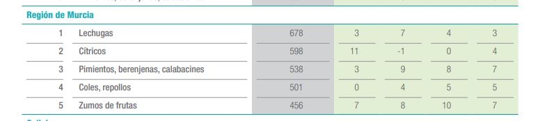 En el top cinco también figuran las coles y los repollos, con 501 millones (crecimiento nulo) y los zumos de frutas, con 456 millones (7% más), un ámbito cuyas empresas murcianas se encuentran entre las principales exportadoras europeas, según destaca el informe.