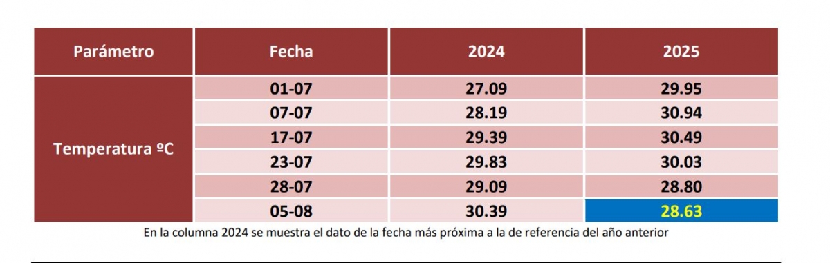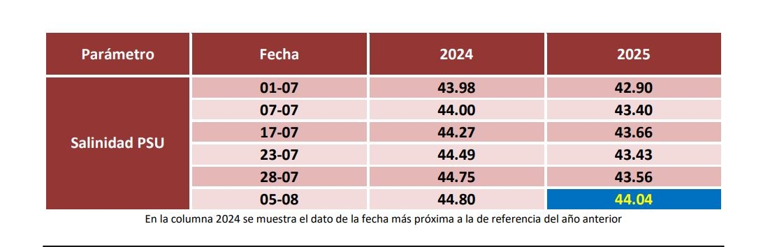En el caso de la salinidad, el informe refleja un dato de 44.04 PSU, lo que supone un ascenso del 1,1%. "El actual nivel es el más alto desde el inicio de julio", destacan.