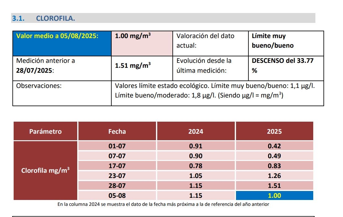 Esta tendencia a la bajada de la temperatura media incide también positivamente en los datos de niveles de oxígeno y clorofila. No en vano, el nivel de clorofila continúa cayendo y registra un descenso del 33.77%. Ahora se sitúa en 1 mg/m3 frente a los 1.51 mg/m3 del 28 de julio.