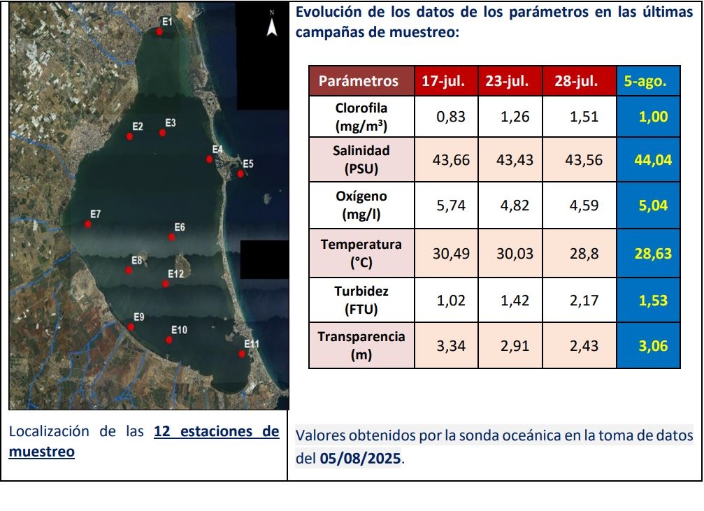 MURCIA. El Mar Menor se recupera del 'susto' de julio y empieza el mes de agosto con una bajada de temperatura, por debajo de los 29 grados, y una estabilización que ha derivado en una mejora de los parámetros que miden su estado, que se acercan ya a los valores habituales de esta época del año. Así lo refleja el el último informe semanal, con datos a 5 de agosto y elaborado por el Gobierno regional a través de su red de control con 22 puntos de vigilancia. El estudio pone de manifiesto "una confirmación de la evolución positiva de los parámetros" y "una tendencia de mejora", ya prevista por los expertos tras la intensa ola de calor registrada a principios de julio.