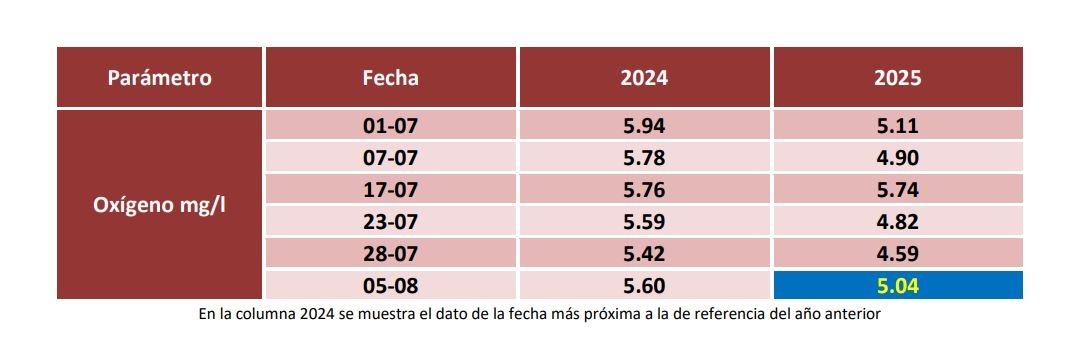 En cuanto al oxígeno, el nivel se sitúa ya por encima de los 5 miligramos por litro; en concreto 5.04 mg/l, lo que es una subida del 9,8% frente al valor registrado a finales de julio (4,59 mg/l).