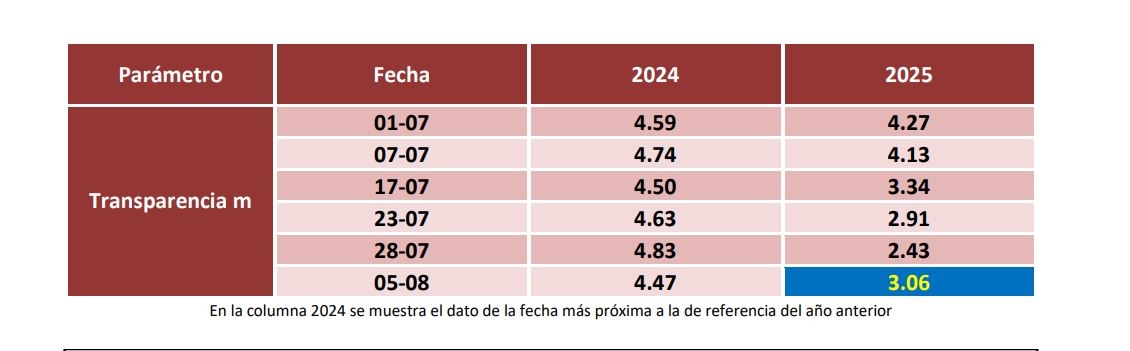 En el caso de la transparencia, el valor medio se sitúa en 3.06 metros, lo que signigfica un aumento del 25,93% respecto a los datos de finales de julio.