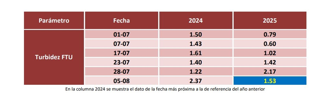 La turbidez continúa cayendo al pasar de las 2.17 FTU del 28 de julio al actual 1.53 FTU, un descenso del 29.49%.