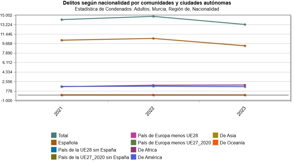 En cualquier caso, tal y como desglosa el INE (Instituto Nacional de Estadística), en 2023 (último año con datos actualizados), de los 13.236 delitos cometidos (con condena en curso) en la Región, 9.237 tenían la nacionalidad española mientras que 1.885 eran de origen africano y 1.573 procedían de América. En este primer trimestre de 2025, el balance de criminalidad del Ministerio del Interior, que no aclara la nacionalidad del presunto delincuente, recoge 443 infracciones penales en Torre Pacheco de un total de 17.390 en las poblaciones de la Región con más de 20.000 habitantes. Es la séptima con más casos pese a ser la sexta más poblada. Aunque es un 4,1% más que en el mismo periodo de hace un año, el cuarto mayor repunte de la Región.