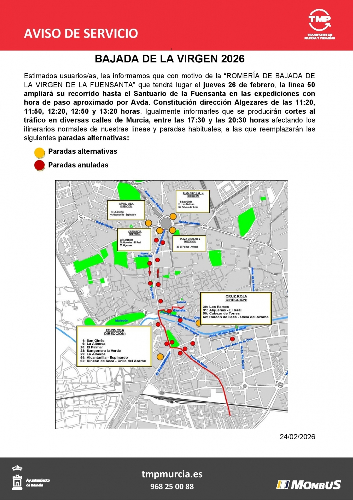 De forma previa a la bajada, la línea 50 ampliará su recorrido hasta el Santuario de la Fuensanta entre las 11:00 y las 13.30.