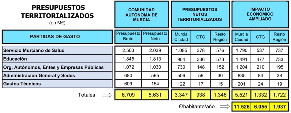Para estimar ese efecto se aplica la regla de la Capacidad de Absorción, que tiene en cuenta factores como la densidad empresarial o el nivel de servicios de cada zona. De este modo, se obtienen distintos coeficientes multiplicadores de las partidas de gasto, que para nuestros territorios han sido: 1,65 en Murcia, 1,42 en Cartagena y 1,28 en el resto de la Región.