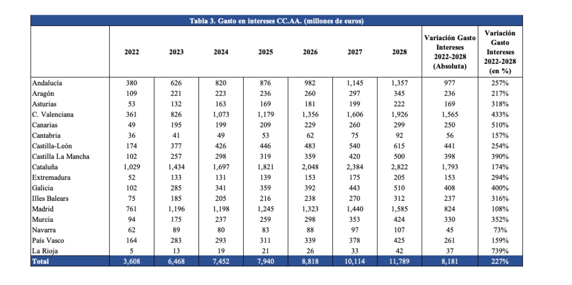 En 2022, el gasto autonómico en intereses registrado por Hacienda ascendió a 3.608 millones de euros, por lo que Fedea estima que, bajo sus supuestos, esa cifra se incrementaría hasta los 11.789 millones de euros en 2028.