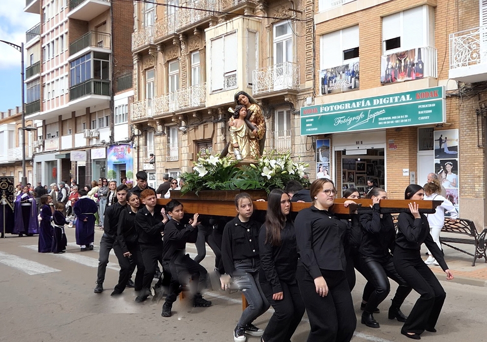 Esta procesión porta cinco imágenes hechas exclusivamente, realizadas por el escultor imaginero unionense Galo Conesa. El recorrido sale del Colegio de Ntra. Sra. del Carmen y continúa hasta el Templo de Ntra. Sra. del Rosario, llenando la calle Mayor de alegría, juventud, emoción y sentimiento religioso.