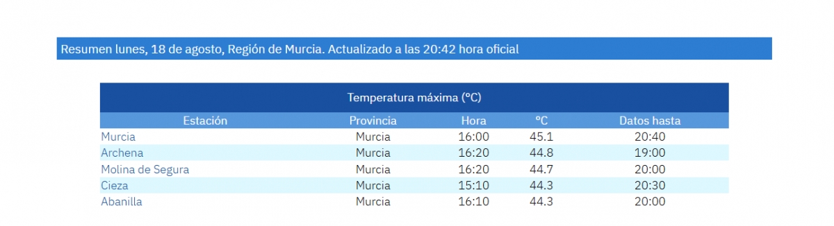 La segunda máxima más alta detectada este lunes se dio en Archena, con 44,8 grados a las 16.20 horas. A esa misma hora Molina de Segura alcanzaba los 44,7 grados. Completan este abrasador 'top 5' de la Región Cieza, con 44,3 grados a las 15.10 horas y Abanilla, con 44,3 grados a las 16.10 horas.