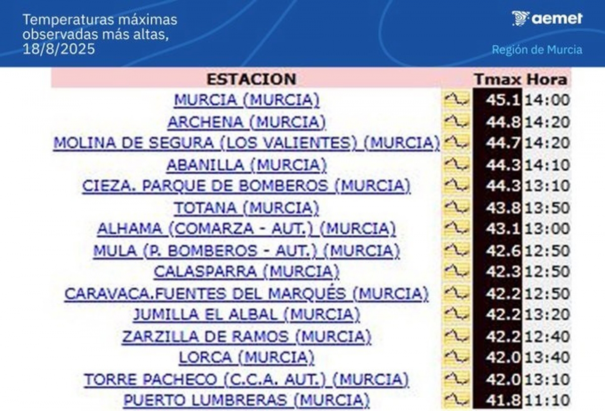 El aviso rojo se activó este domingo, con temperaturas máximas de hasta 44 grados. Ese día Cieza alcanzó los 44,2 grados a las 16.40 horas y Archena llegó a 44,1 grados a las 17 horas. Murcia se quedó a las puertas de los 44 grados, con 43,6 grados registrados.