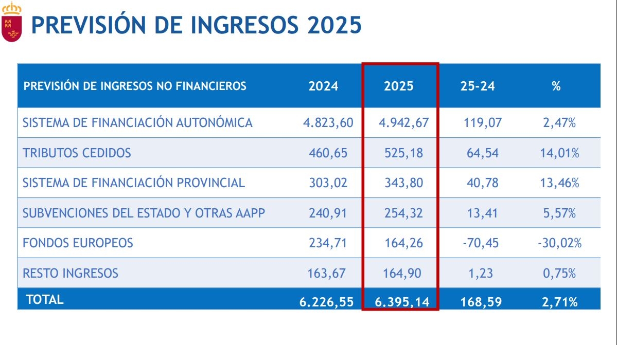 El dato utilizado para calcular el techo de gasto, ha dicho, ha sido avalado por la AIREF “por serio, riguroso y responsable”, dijo. En cuanto a las previsiones de crecimiento para este año, que el Ejecutivo de López Miras ha situado en el 2,5 por ciento, a pesar de que organismos como BBVA Research prevén un crecieron del 2,9 por ciento. En el cálculo entran también los ingresos a través de los fondos europeos, que han caído de 234 millones de euros en 2024 a 164 millones de euros en 2025.