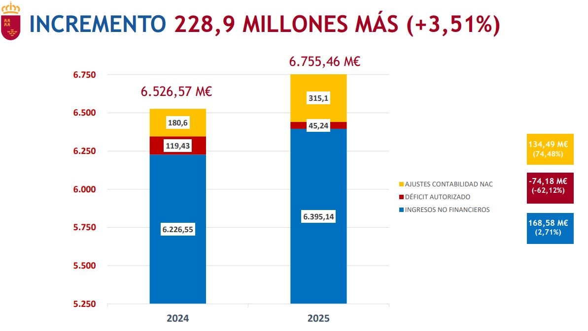 Marín ha destacado que este techo de gasto "supera la barrera de los 6.755 millones de euros" y representa un crecimiento del 3,5% respecto al ejercicio anterior. "Tenemos, por tanto, un techo de gasto que vuelve a ser histórico", ha recalcado. El aumento se debe sobre todo al incremento de la recaudación tributaria, que creció un 14 por ciento. Además, la Región dispondrá de un objetivo de déficit de un 0,1% (equivalente a unos 45 millones de euros) a pesar de que "esta cifra no ha sido aprobada aún por el Congreso", por lo que no ha sido comunicado de manera oficial a las comunidades autónomas.