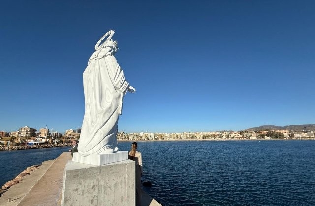 La imagen de la Virgen del Carmen destaca por su envergadura y calidad artística, ya que se trata de una escultura tallada artesanalmente en un único bloque de mármol blanco de Macael, con una altura de 4,2 metros y un peso aproximado de 4.800 kilogramos. Ubicada en la bocana del muelle pesquero del Puerto de Mazarrón, "la obra se erige como un nuevo referente emocional, patrimonial y turístico, llamada a convertirse en un símbolo de protección, identidad y arraigo tanto para los vecinos como para quienes visitan Mazarrón", aseguran desde el Consistorio mazarronero.